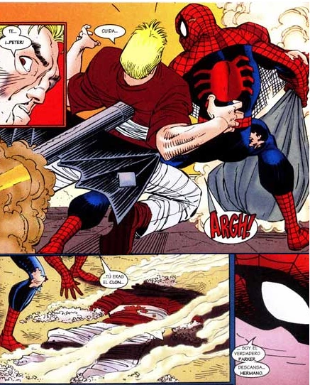 | Por favor, Peter. Esto es más oscuro que el rojo. Es más como… escarlata. Soy yo, Peter, Ben Reilly. Tu hermano de otra célula de sangre. | ||