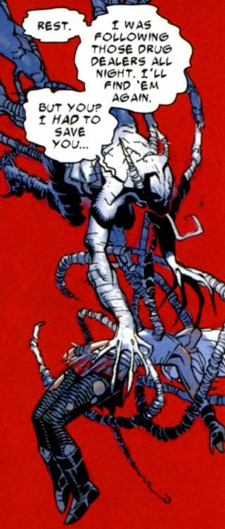 Informado por Liz Allan de que haber sido limpiado por el suero Anti-Venom había curado a Eddie de su aflicción metabólica, Venom decidió celebrar aprehendiendo a Looter. Fue atacado por Spider-Woman pero logró escapar distrayéndola usando a Looter como una distracción. Ella logró rastrearlo hasta su apartamento y dejó inconsciente a Eddie, pero antes de que pudiera llevarlo a prisión, el simbionte se unió a ella y le informó que estaba a punto de dar a luz a un séptimo engendro; haciendo que deje ir a regañadientes a Eddie.