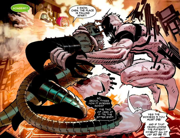 Eddie lleva Spider-Man de nuevo a OsCorp y los dos se separan, debido al débil estado de Spider-Man en la presencia de Eddie. Brock se disfraza de Spider-Man para distraer a los demás Thunderbolts mientras Spider-Man va tras Osborn. Después de vencer a Songbird y Radioactive Man, Anti-Venom enfrenta Gargan, que ahora encarna sus dos poderes de forma conjunta como Venorpion. Después de una dura batalla, Gargan golpea al Anti-Venom con su aguijón y le inyecta el veneno que aparentemente destruye el traje de Brock. Gargan avanza para matar a Brock, pero se encuentra con la resistencia del simbionte Venom. El simbionte recupera sus fuerzas y destruye el traje de Gargan, negándose a dejar que Mac asesine a Brock.
