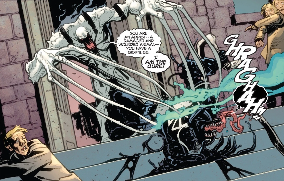 Poison Spider-Man fácilmente derrotó a Venom y estaba a punto de unirlo con un Poison sin huésped cuando Venompool, Spinneret y Logan Venom intervinieron; y Poison Spider-Man se retiró cuando los venoms hostiles fueron asesinados. Con el agente Venom muerto, el Hombre Araña y el Capitán Venom se consumieron, y Venompool desertó, Venom propuso que la Resistencia tomara medidas drásticas para derrotar a los Venenos al invocar una versión alternativa de Carnage . Después de que Strange lo hizo, el Carnage alternativo reconoció a Venom, llamándolo "no-papi" y amenazando con matarlo como lo hizo con Eddie Brock de su realidad. Venom trató de razonar con él, pero Carnage en cambio quería pelear con él y los otros Venom presentes. Sin embargo, fueron sorprendidos por un ataque de los Poisons, que los había localizado gracias al nuevo Pozo de Envenenamiento. The Poisons tomó al Doctor Strange y consumió a Host Rider, quien fue asesinado por Carnage. Tras reubicarse en una nueva zona segura, Venom persuadió a Carnage para que aceptara una tregua, pero Cletus dijo que una vez que la guerra contra los venenos terminara, su alianza habría terminado y los mataría a todos también. Tomando las riendas del equipo, Venom ayudó a liderar una misión de rescate con la ayuda de Poison Deadpool (quien conservó su personalidad original), derrotó a Poison Spider-Man en una revancha y destruyó el barco de los venenos antes de regresar a la Tierra-616.