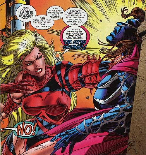 Cuando Spider-Man se dirigía al juicio de Ben Reilly en el cual era acusado de los asesinatos provocados por Kaine, este ataca a Spider-Man impidiéndole que fuese a declarar, en el transcurso de la batalla aparece Stunner, la compañera del Doctor Octopus, buscando a Kaine para vengar a su amado, pero antes de que ella pudiera atacarlos, Spider-Man y Kaine son teletransportados por Judas Traveler para enjuiciar a Spider-Man, en este juicio Kaine se enfrenta a Traveler y a Carnage pero no puede evitar ser derrotado, al volver al lugar de donde fueron raptados, Stunner los esperaba pero esta vez Kaine se encontraba debilitado por la pelea y no podía defenderse, cuando Stunner le estaba por asestar un golpe mortal, Spider-Man intento razonar con ella y viendo que la mujer no cambiaba de parecer la ataco solo para enfurecerla más lo que hizo que provocara el derrumbe de una construcción dejándola atrapada entre los escombros.