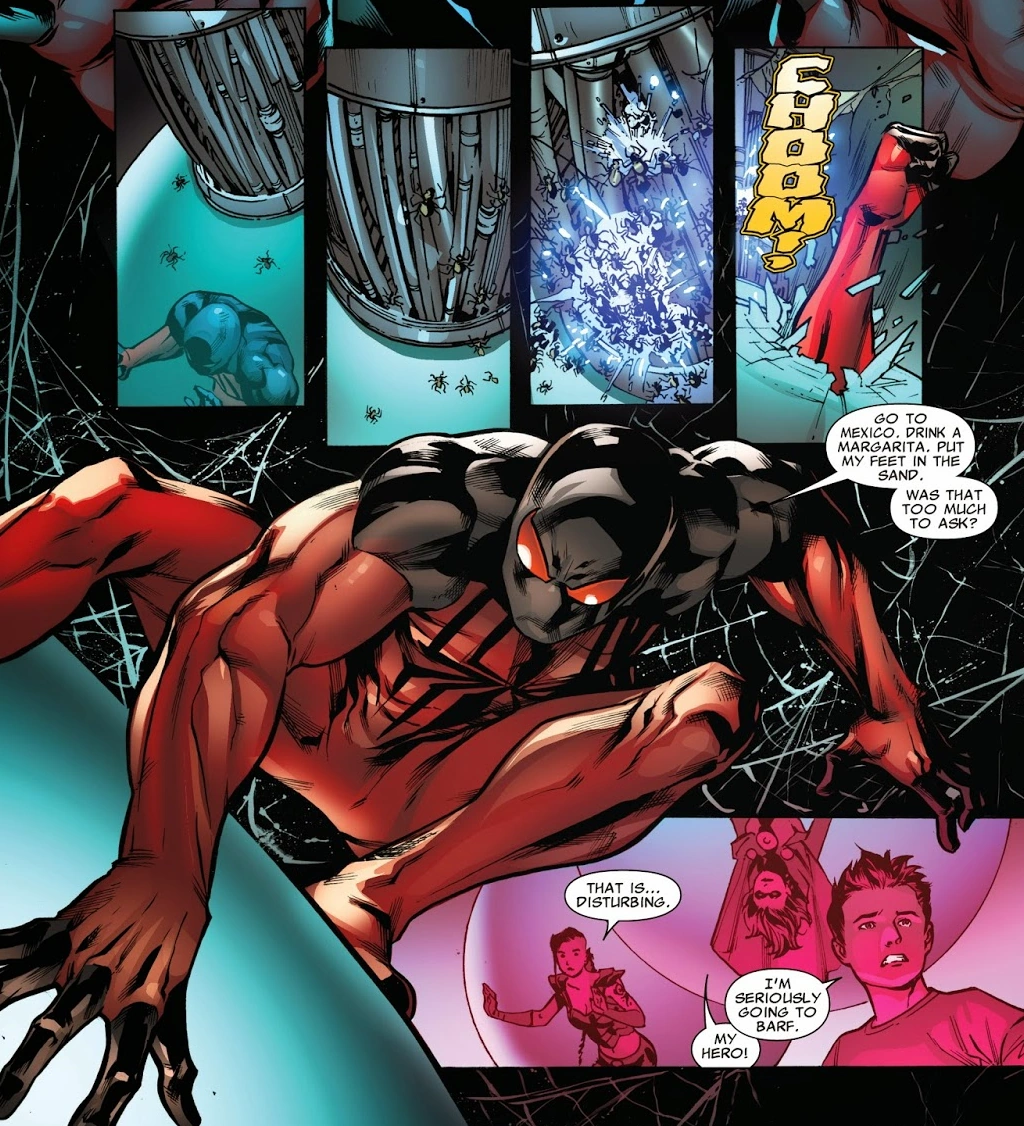 Cuando Kaine recupera la conciencia descubre que se ha separado de Venom durante el viaje y a un misterioso hombre vestido de verde que está de pie a su lado que no le advierte de un criatura similar a un escorpión gigante muy enojado a punto de atacar. Scarlet Spider derrota a la criatura y el extraño revela su nombre como el Redentor, quien sana las heridas de Kaine. A medida que exploran el Microverso el Redentor revela un poco más sobre quién es en realidad. Ambos son tomados por sorpresa por Carnage, que procede a atacar a Scarlet Spider.