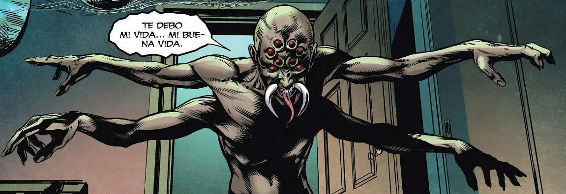 - Transformación: Con solo pensarlo, Patton puede transformarse total o parcialmente en una criatura monstruosa con colmillos, quelíceros venenosos, ocho ojos compuestos, cuatro brazos y cuatro piernas.