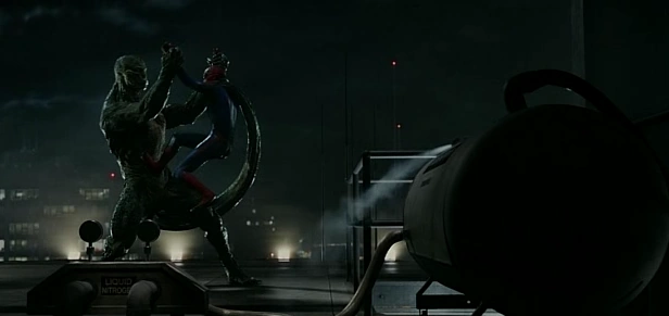 En el puente, Peter se enfrenta a una criatura reptil de gran tamaño, conocido como el lagarto. Peter se las arregla para interceptar al villano, pero es incapaz de luchar contra él, ya que él rescata a un niño pequeño de un coche en llamas mientras el lagarto escapa. Es allí donde Peter toma el nombre de Spider-Man y el público empieza a conocerlo ampliamente.