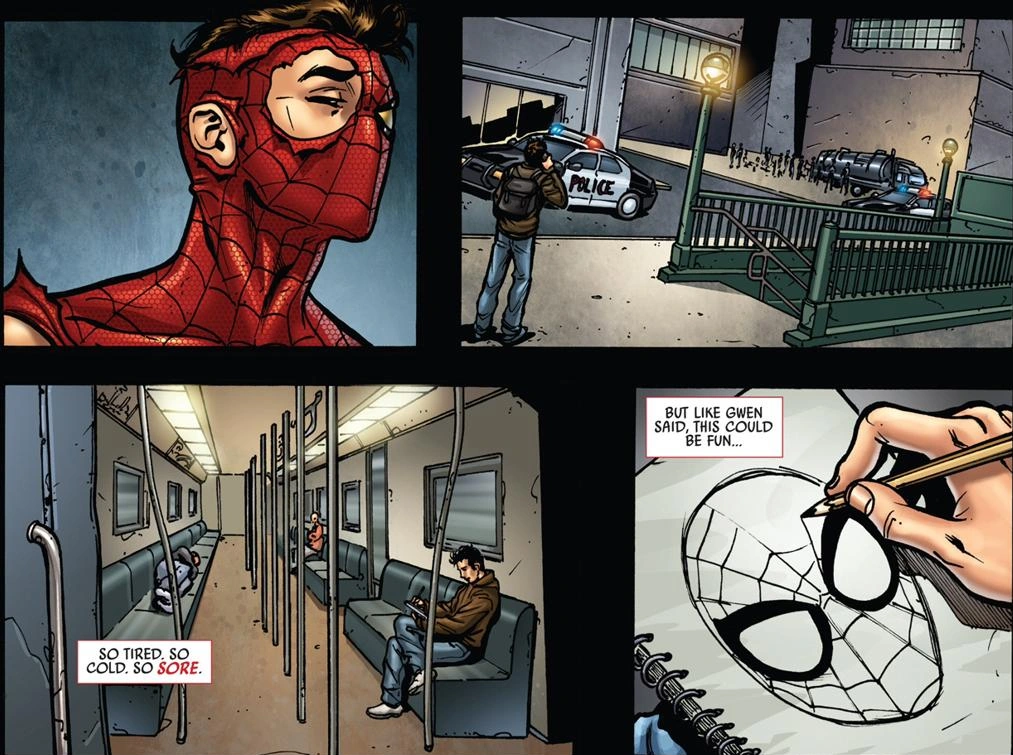 Llegando antes que la policía Spider-Man ve algunos criminales sacando cajas de una camioneta y así los persigue. Al entrar en el edificio rápidamente se da cuenta de que los delincuentes lo han llevado a una trampa cuando uno de ellos activa una gran maquina centrífuga en la cual Spider-Man cae pero él logra sobrevivir gracias a la rapidez de su pensamiento y se las arregla para capturar al resto de los matones. Más tarde, mientras esta en el metro, Peter decide seguir el consejo de Gwen y comienza a elaborar diseños para un nuevo traje.