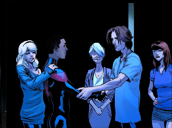 Una vez Miles amenaza con decirle a la tía May sobre esto, Peter le replica que eso no es asunto suyo ya que nadie le pidió que asumiera el rol de Spider-Man. Miles le responde que tal vez es cierto pero todos los que el conoció le pidieron que fuera Spider-Man. Peter le responde que lo sabe ya que lo vio en su casa mientras asistía a su aniversario de fallecimiento. Miles le pregunta si es de otra dimensión debido a que el conoció a otro Peter Parker, pero Peter cree que esta desvariando, así que le pide sus Lanza-Redes nuevamente.