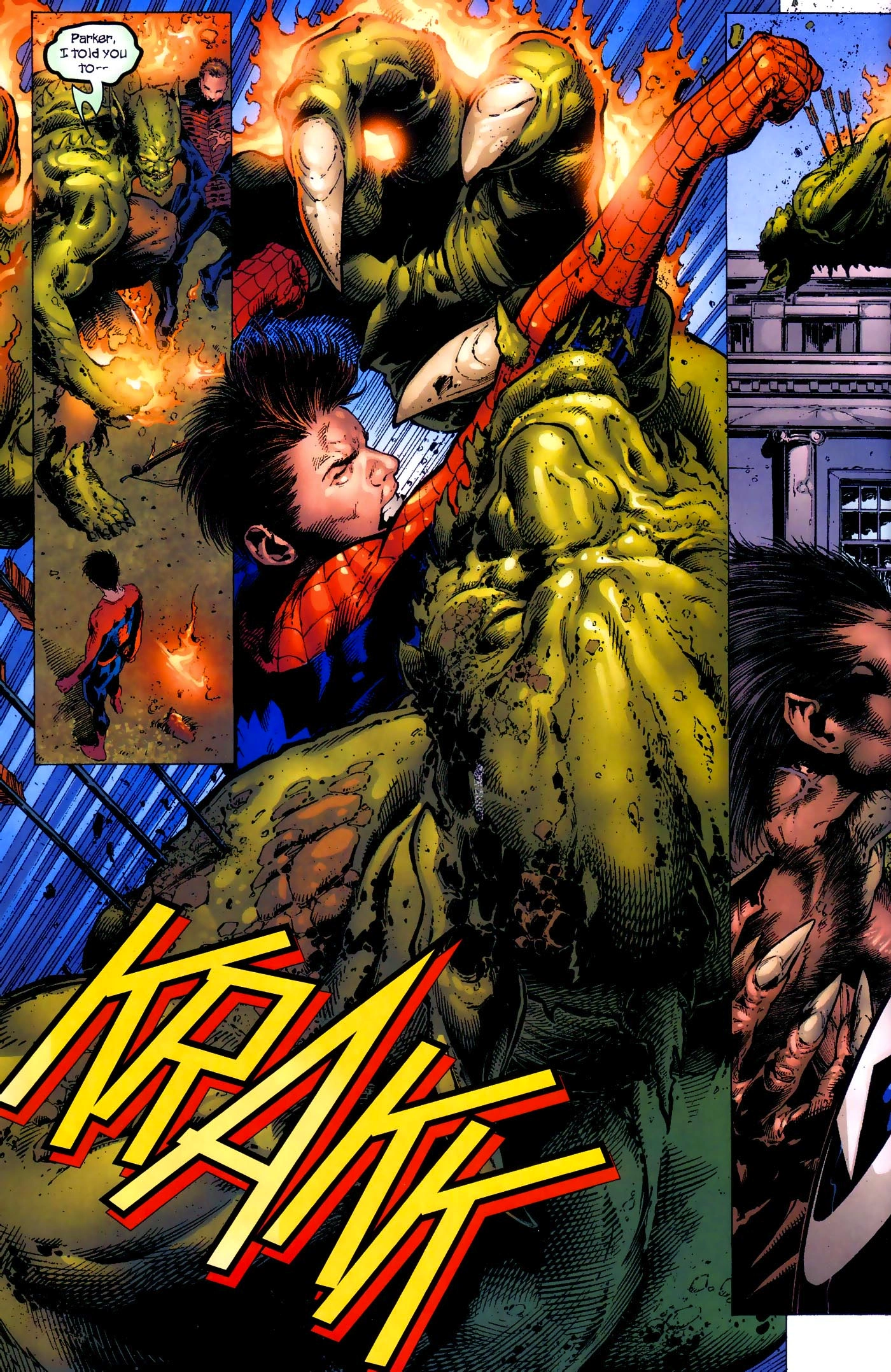 Al llegar, Peter es confrontado primero por el Buitre a quien manda a volar con sus telarañas. Luego Electro, Hombre de Arena y Kraven lo atacan en grupo pero Spider-Man rompe un hidrante cercano y usa sus manos para generar mayor presión y la usa contra los vilanos que terminan electrocutados al chocar con Electro, a quien Peter golpea fuertemente, los vecinos que ven el combate descubren su identidad mientras Hombre de Arena lo ataca violentamente. Buitre reaparece y golpea a Peter para luego lanzarle bombas, Spidey usa su telaraña para disminuir el impacto de la explosión pero aun así resulta gravemente lastimado.