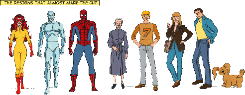 - En sus identidades civiles, Peter Parker se parecía al mismo personaje de los cómics, mientras que Angelica Jones y Bobby Drake eran similares a los amigos de Peter, Mary Jane Watson, y Flash Thompson. Flash Thompson también fue presentado en la serie de televisión, pero tenía el cabello castaño en lugar de rubio.